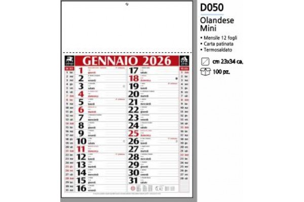 Calendario mensile, 12 fogli, carta patinata, termosaldato.