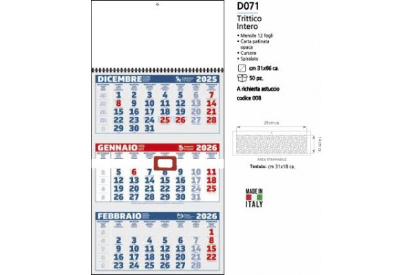 Calendario mensile, 12 fogli, carta patinata opaca, con cursore, spiralato.