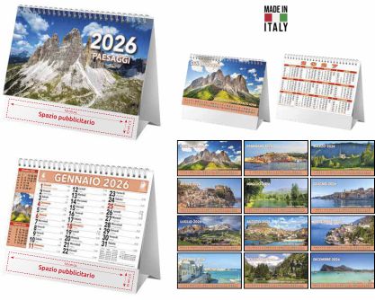 Calendario mensile da tavolo, 13 fogli, carta patinata lucida, spiralato.