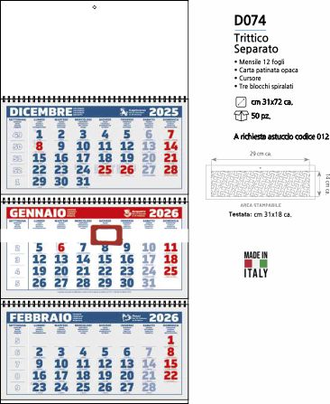 Calendario mensile, 12 fogli, carta patinata opaca, con cursore.