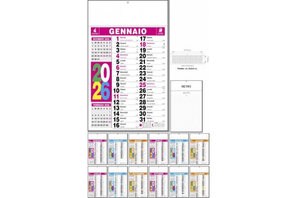 Calendario mensile, 12 fogli, carta patinata, termosaldato.